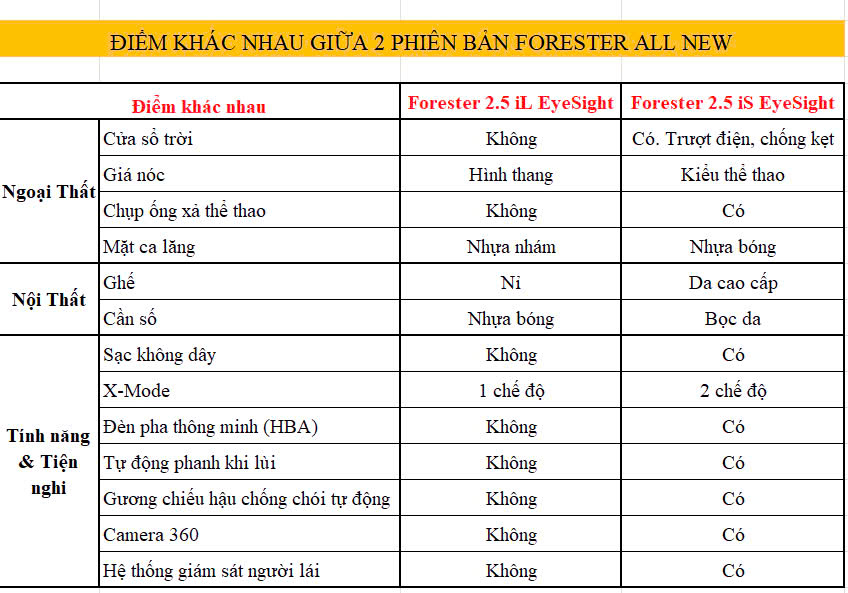 Phiên bản Forester 2.5i-S EyeSight được trang bị thêm: Camera toàn cảnh 360; Cửa sổ trời; Ghế da tuỳ chọn; Sạc không dây; Thanh giá nóc Thể thao; Hệ thống giám sát người lái, Phanh tự động khi lùi; Các chi tiết lưới tản nhiệt….