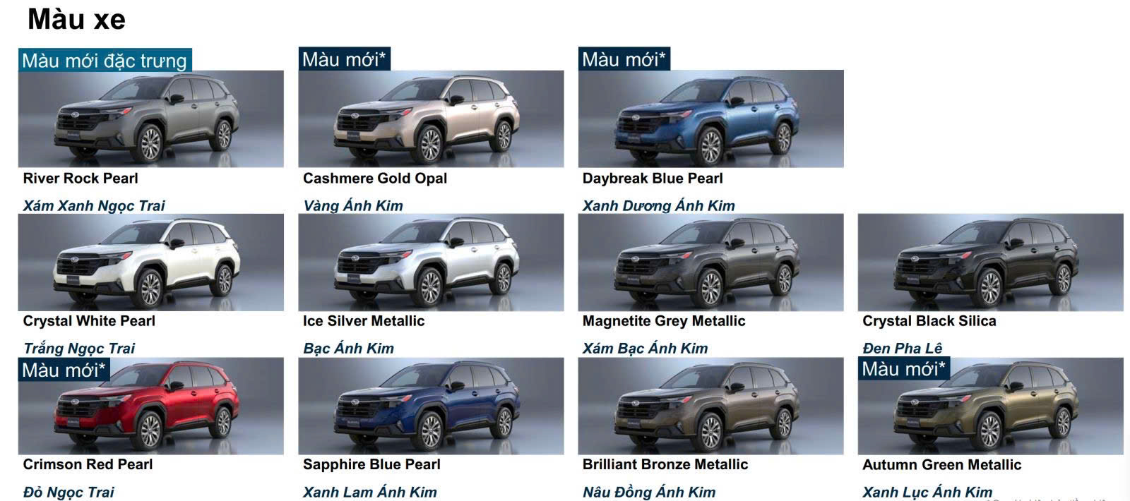Ngoại Thất Subaru Forester 2026 Thế Hệ Mới có 11 màu tuỳ chọn bao gồm: